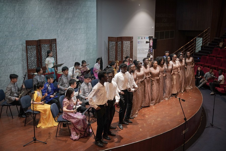 Members of the traditional instrument orchestra of China's Nanjing University perform with Kenyan singers at the University of Nairobi in Nairobi, Kenya, on April 18, 2024. (Xinhua News Agency/Han Xu)