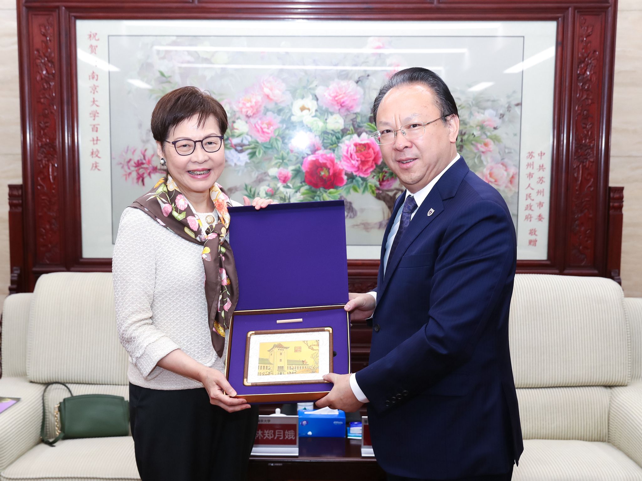 On behalf of the university, Tan Tieniu extended a warm welcome to Carrie Lam and Sophia Dan, and expressed heartfelt gratitude for their longstanding support for NJU. He introduced the latest development of the university. He highlighted the university's commitment to promoting collaboration between Jiangsu and Hong Kong. In recent years, NJU has strengthened its exchanges with Hong Kong and deepened its cooperation with various sectors of Hong Kong society. Tan expressed his hope to further enhance this cooperation, combining the wisdom of Jiangsu and Hong Kong to advance talent cultivation, research innovation, and cultural exchange.
