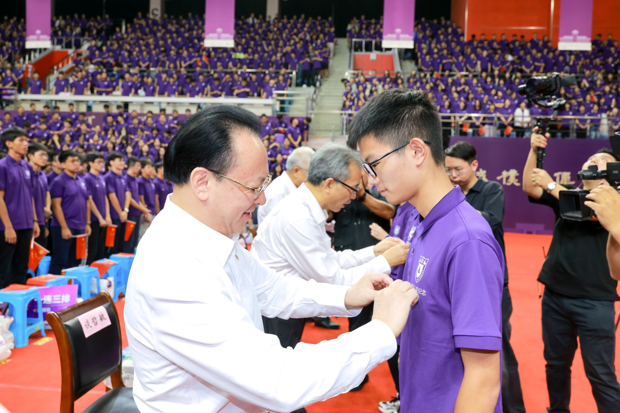 与会校领导和嘉宾为新生代表佩戴校徽。全体新生为自己戴上了这枚象征“凯发人”身份的徽章。