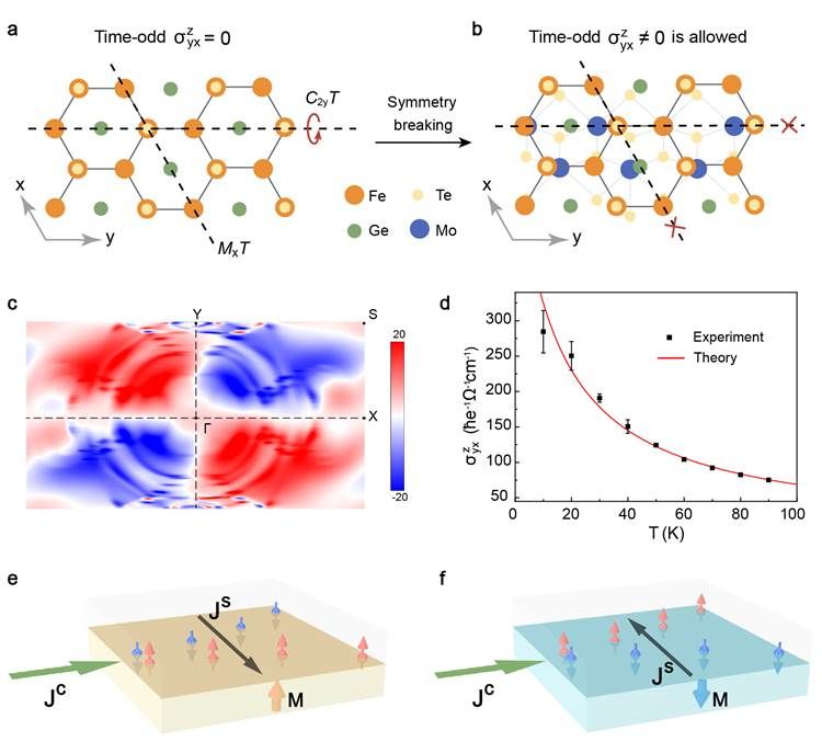 理论计算揭示,观测到的磁自旋霍尔效应来源于FGT/MoTe2异质结界面诱导的对称性破缺对磁性与拓扑耦合的能带的调制作用。研究团队通过对称性分析发现,单一FGT材料的高对称性使磁自旋霍尔电导分量为零(图3a)。而通过“原子乐高”界面工程可以打破对称性的限制(图3b),在FGT/MoTe2异质结体系中实现界面磁自旋霍尔效应。为进一步揭示界面磁自旋霍尔效应的微观机制,研究团队引入了可直接刻画该效应的物理量,即自旋流偶极矩,其动量空间积分即为体系的磁自旋霍尔电导。第一性原理计算表明自旋流偶极矩动量空间分布不具有空间反演对称性(图3c),表明异质结体系的磁自旋霍尔电导分量