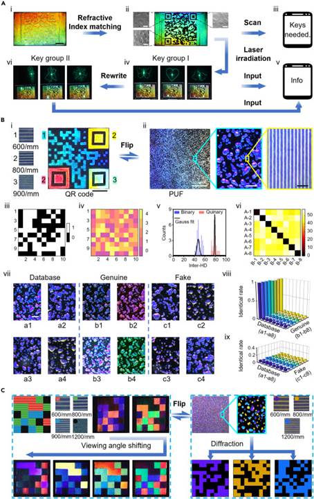图4:用于多级和多层加密的多功能压印丝膜。(A)多级加密二维码标签。(B)复合了多色二维码以及PUF的多层级防伪标签。(C)复合了三维彩码以及多色PUF的多层级防伪标签。