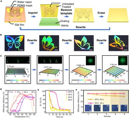 图2:基于水蒸气辅助微/纳米压印技术的光学结构的重写。(A)图案化光学结构的制备和重写示意图。(B)四种不同姿势的蝴蝶图案的连续书写。(C)不同衍射光学元件之间的可控重写。(D)丝膜衍射效率与水蒸气处理条件的关系。(E)残余衍射效率(Dr)与初始衍射效率(Di)之比与水蒸气中擦除时间的关系。(F)连续多次压印过程中丝膜衍射效率的变化。