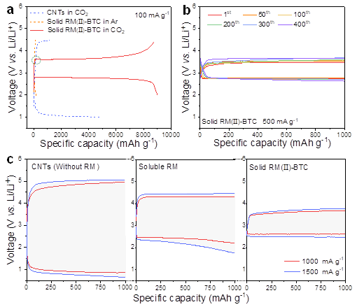 2 基于CNTs和固态RM(II)-BTC正极的Li-CO2电池电化学性能。(a)全充放性能对比;(b)定容循环性能对比;(c)大电流倍率性能对比。