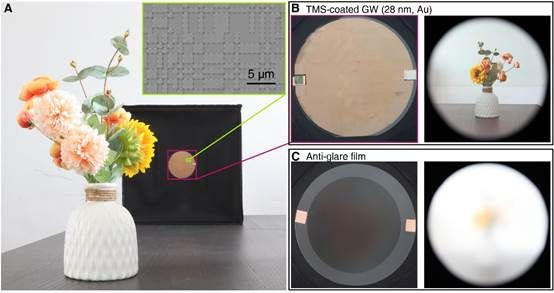 2024年,该团队在原有的工作基础上开拓创新,首次基于成熟的工业级步进式光刻技术,首次在玻璃表面加工了在全可见光频段具有完美漫反射功能和高度透明性的宏观尺寸超表面(直径为10厘米)(Science Advances 10, eadm8061 (2024))。这种超表面被称为:透明哑光表面(transparent matte surfaces)。具有这种表面的透明材料在透射上具有极高的透明清晰程度,类似于透明玻璃;而在反射上则具有类似粗糙物体的哑光外貌。