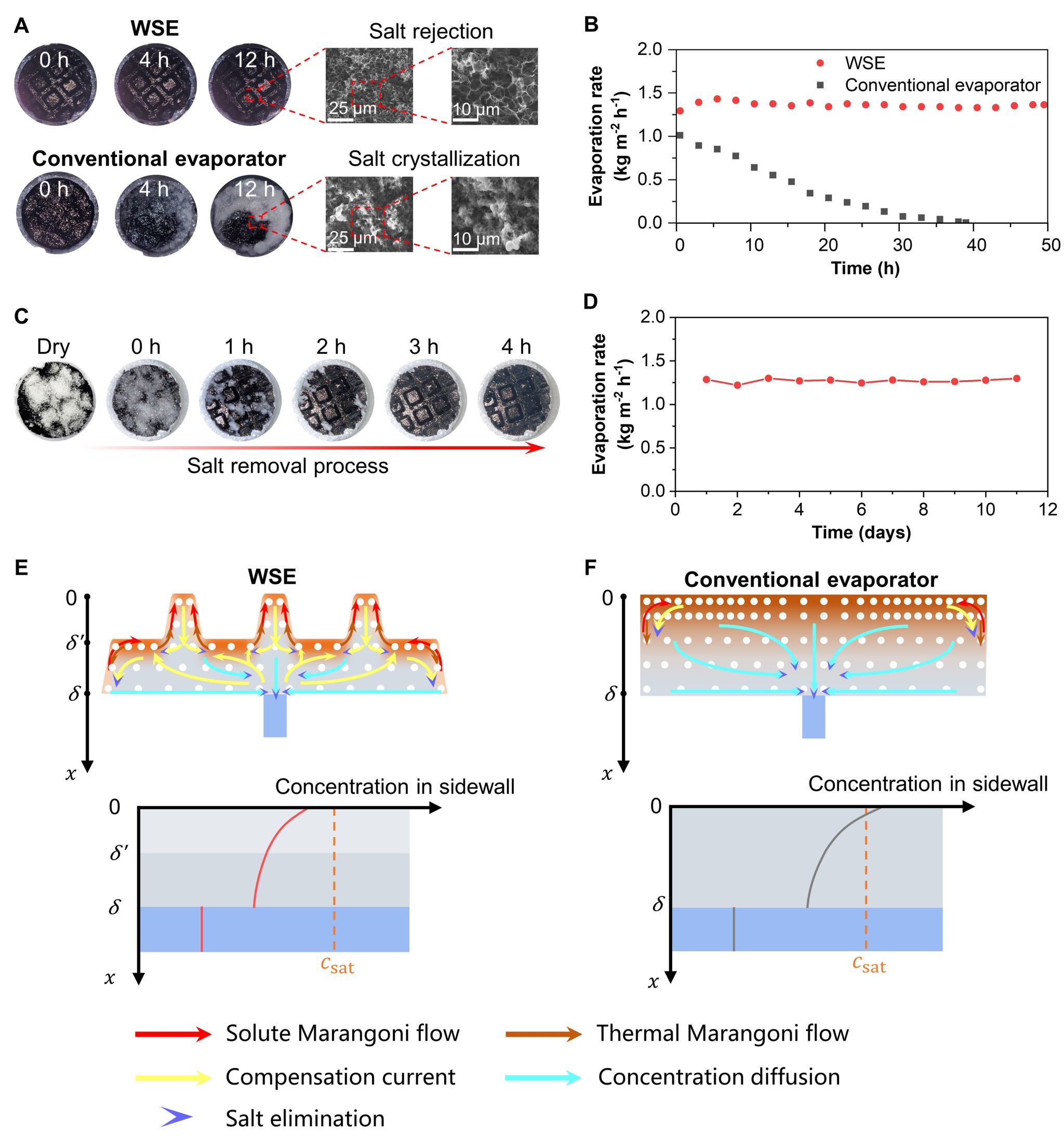 图3. WSE在1太阳辐照强度下的抗结盐性能。(A)处理5 wt%盐溶液时,WSE蒸发器保持清洁,而平面蒸发器被盐晶体覆盖。(B)WSE和平面蒸发器处理5 wt%盐溶液的蒸发性能。(C)在WSE上人为地添加2.5g盐晶体,甚至这些盐晶体亦可被输运至海水体相。(D)WSE处理10 wt%盐溶液的11天长期性能。(E)马兰戈尼效应驱动了WSE内的对流,降低了整个体系的最高盐度。(F)平面蒸发器体系的最高盐度,超过了饱和值。