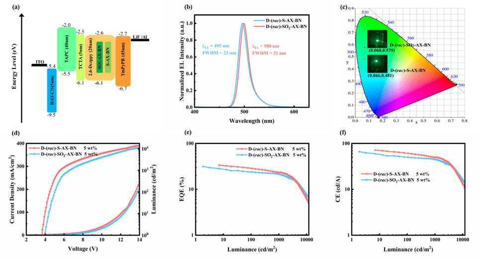 基于S-AX-BN和SO2-AX-BN制备的CP-OLED器件D-(rac/R/S)-S-AX-BN和D-(rac/R/S)- SO2-AX-BN在495和500 nm处展示出极窄的电致发光(FWHM=22, 21 nm),在基于目前已知CP-MR-TADF的器件中属于最窄的,并展示出33.5%和31.5%的最大外量子效率(EQEmax)与较低的效率滚降。更重要的是,它们分别获得了稳定且镜像对称的圆偏振电致发光(CPEL)光谱,其|gEL|分别为3.3×10-3和2.2×10-3,是该领域轴手性同类CP-MR-TADF材料中的最高值。