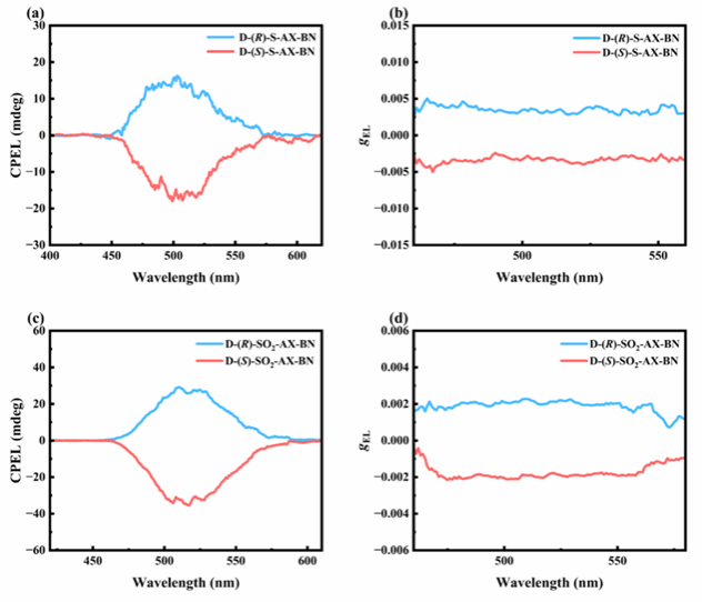 图4. CP-OLEDs性能:(a), (c) CPEL光谱; (b), (d) gEL-波长曲线。