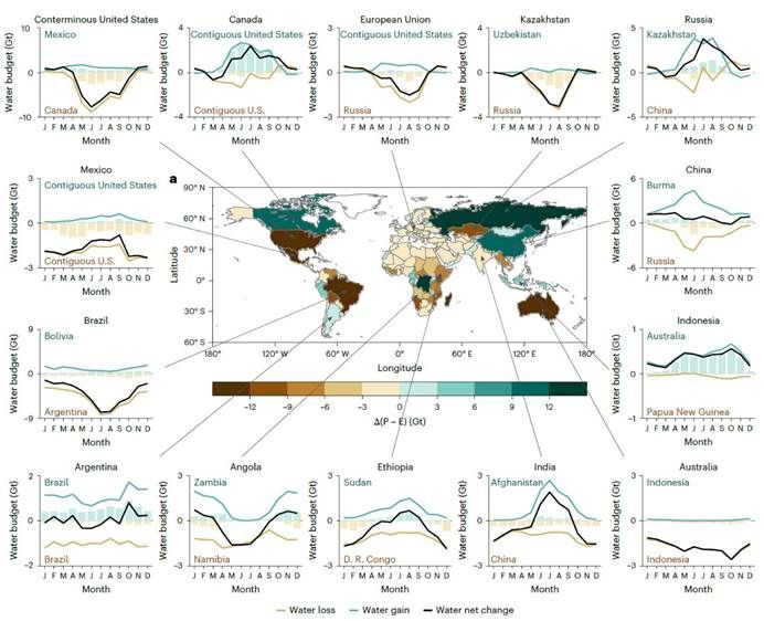进一步在国家尺度的分析表明,植树造林蒸发的水汽会在大气环流的作用下在各个国家之间形成跨境传输,导致不同国家的降水反馈和P-E的变化产生差异(图3)。植树造林会造成有些国家的P-E减少,主要包括非洲、西亚、中亚、美国、墨西哥、澳大利亚等国家。特别是非洲,西亚和中亚这些地区和国家,人均水资源比较匮乏,植树造林引起的P-E下降可能会进一步加剧这些地区和国家的水资源危机和冲突。相反,植树造林也会导致部分国家的P-E增加,例如加拿大、俄罗斯、印度尼西亚和刚果民主共和国等国家,而这些国家大多人均水资源较多。因此,植树造林加剧了各国之间人均水资源的不平等性。
