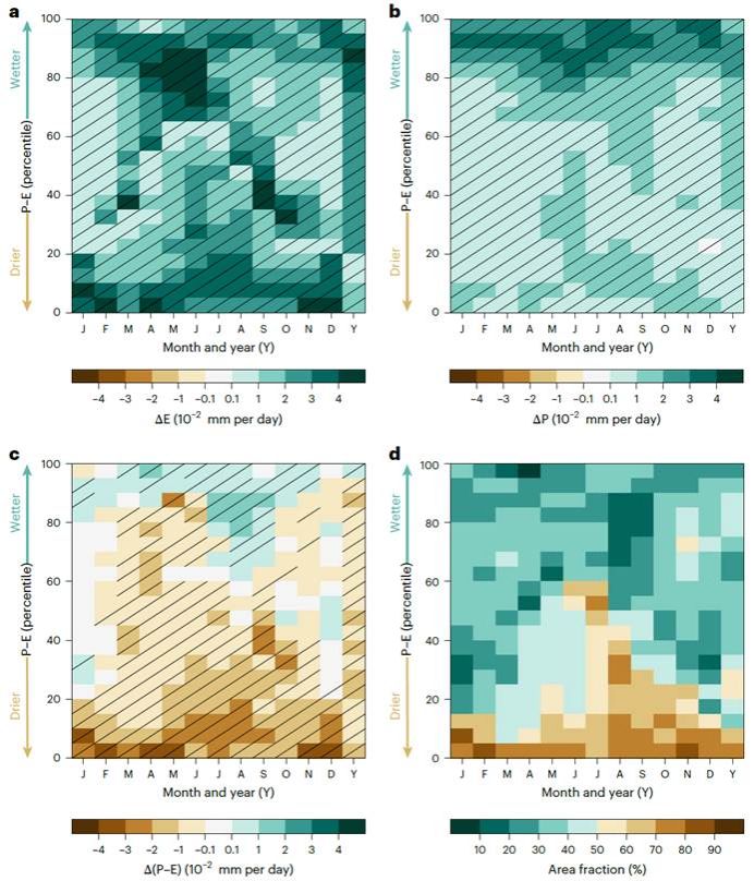 大气科学学院葛骏助理教授和凯发k8官网信息工程大学魏江峰教授结合卫星遥感资料和水汽示踪数据,分析了P-E及全球植树造林对P-E影响的季节和空间变化。季节维度的分析表明,植树造林导致全球66%的地区湿季(P-E最大的季节)的P-E增大,54%的地区干季(P-E最小的季节)的P-E减小,从而导致64%的地区P-E的季节性增强,即湿季更湿、干季更干(图1)。此外,湿季P-E增大的情况在湿润区更为普遍(72%),而干季P-E减小的情况在干旱区更为普遍(63%)。