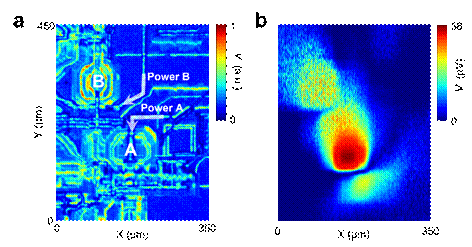 为了进一步验证约瑟夫森探针显微镜的实际检测能力,研究团队利用显微镜系统,对电子科学与工程学院杜源副教授课题组研制的微波振荡器芯片进行了微波近场探测(图5),成功实现了芯片的波谱成像和信号分析。
