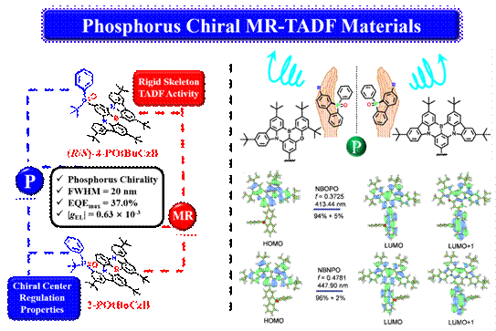 圆偏振发光(CPL)在3D显示中有着广阔的应用前景,而手性发光材料在吸收光能或施加电场时可以直接产生CPL,相对于利用偏振片的器件具有结构简单和能量损失较小的优势。其中,作为发光核心的圆偏振热激活延迟荧光(CP-TADF)材料相比于效率较低的手性荧光材料和贵金属参与的手性磷光材料,其既能够有效利用单、三线态激子实现高效圆偏振发射,又能降低材料成本,使其在高效的圆偏振有机电致发光器件(CP-OLED)和3D显示中具有更大的应用潜力。然而传统的CP-TADF效应的实现伴随着强烈的分子内电荷转移,导致发光光谱的半峰全宽较宽(FWHM > 60 nm),严重限制了其在超纯彩色显示器的更宽色域中的应用。而对多重共振TADF(MR-TADF)分子进行合理的手性设计或修饰,开发了多种具有圆偏振MR-TADF(CP-MR-TADF)特性的材料,可以同时实现窄谱带发射和CPL特性。但受限于合成化学领域高效修饰其他手性原子的方法仍然相对较少,已报道的CP-TADF材料几乎完全是碳基手性结构。作为另一种重要的手性元素,手性磷原子因其更大的空间体积和显著的电子效应而更具功能性,有望作为新型高效CP-TADF材料的可选方案。