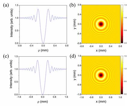 对于一般三维情况,研究人员同样获得了精确解,此时解不唯一。解的形式与光场的轨道角动量有关,不同的拓扑荷数对应不同的解,构成一个光束族。图3显示了拓扑荷数为1时,光场在距离z=25mmz=100mm处的两个横向强度分布图及其对应的强度分布模式。 可以看出,在拉伸图3(a)的横坐标后,这两个横向轮廓完全重叠。