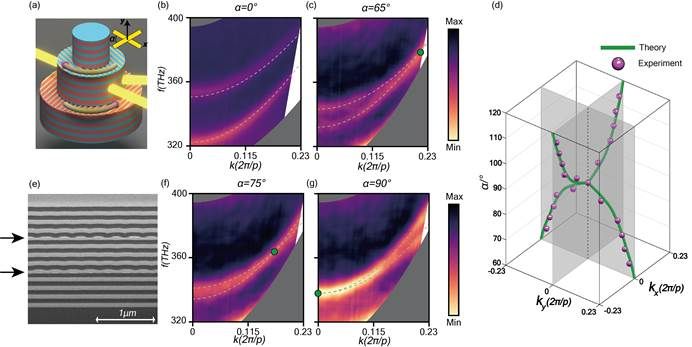 通过使用聚焦离子束刻蚀和电子束蒸镀技术,研究人员在纳米尺度上制备了一系列不同扭角的结构,图2(e)给出了一个扭转样品的SEM横截面图,黑色箭头指示了各向异性超表面的位置。使用微区角分辨光谱技术测量了一系列扭转角下的反射光谱,如图2(b),(c),(f)和(g)所示,界面态在反射谱上表现为反射谷,与理论值吻合(灰色虚线),绿点表示理论所预测的拓扑简并点。实验结果证实了动量空间中拓扑简并点的存在。同时,通过对一系列扭转角下简并点位置的标定,给出了扭转角-动量合成维度空间中存在的拓扑节线和拓扑链接结构(如图2(d)所示)。
