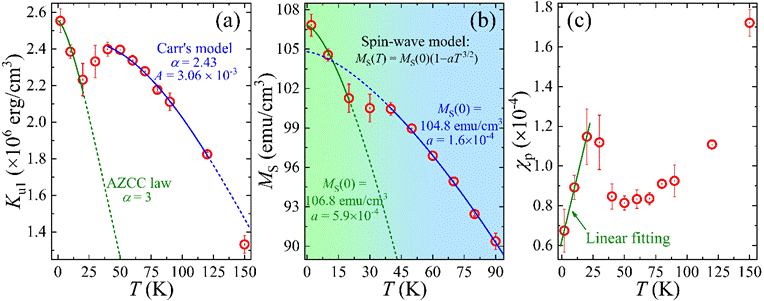 图1. 二维Fe3GeTe2的Ku1 (a)、MS (b)和χp (c)随温度的变化关系。