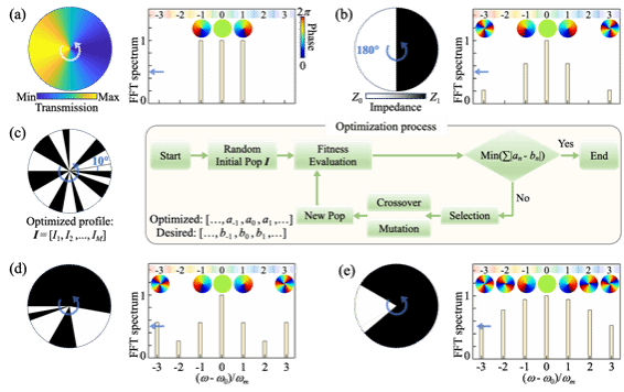 图2: (a) 具有连续和(b) 离散透射特性的声学时空超表面。(c) 用于优化频谱和OAM谱分布的算法流程图。(d), (e) 优化后的时空超表面结构及其对应的能量谱分布。