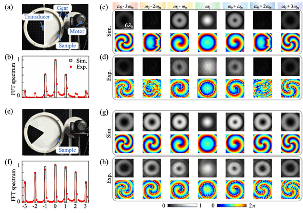 图3:(a), (e) 声学时空超表面样品。(b), (f) 能量谱分布的模拟和实验结果。(c)-(d), (g)-(h) 不同谐波频率下的声场分布模拟和实验结果。