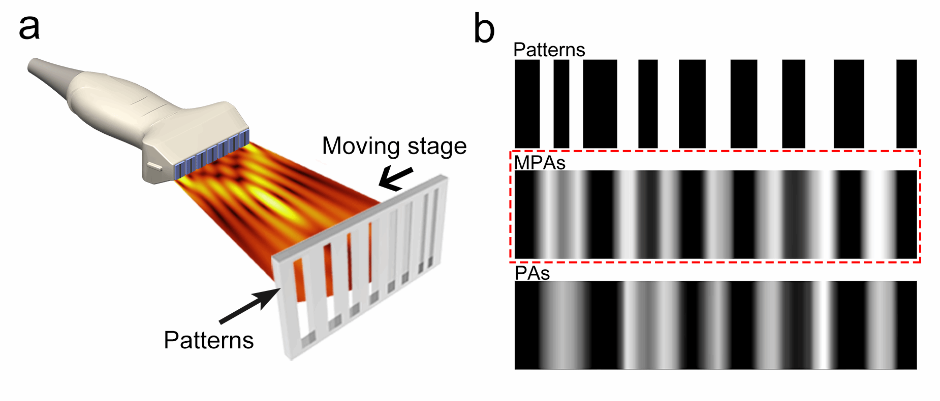 图3.亚波长声成像。(a)实验装置示意图;(b)MPAs和PAs的亚波长(0.3λ-0.6λ)成像效果。