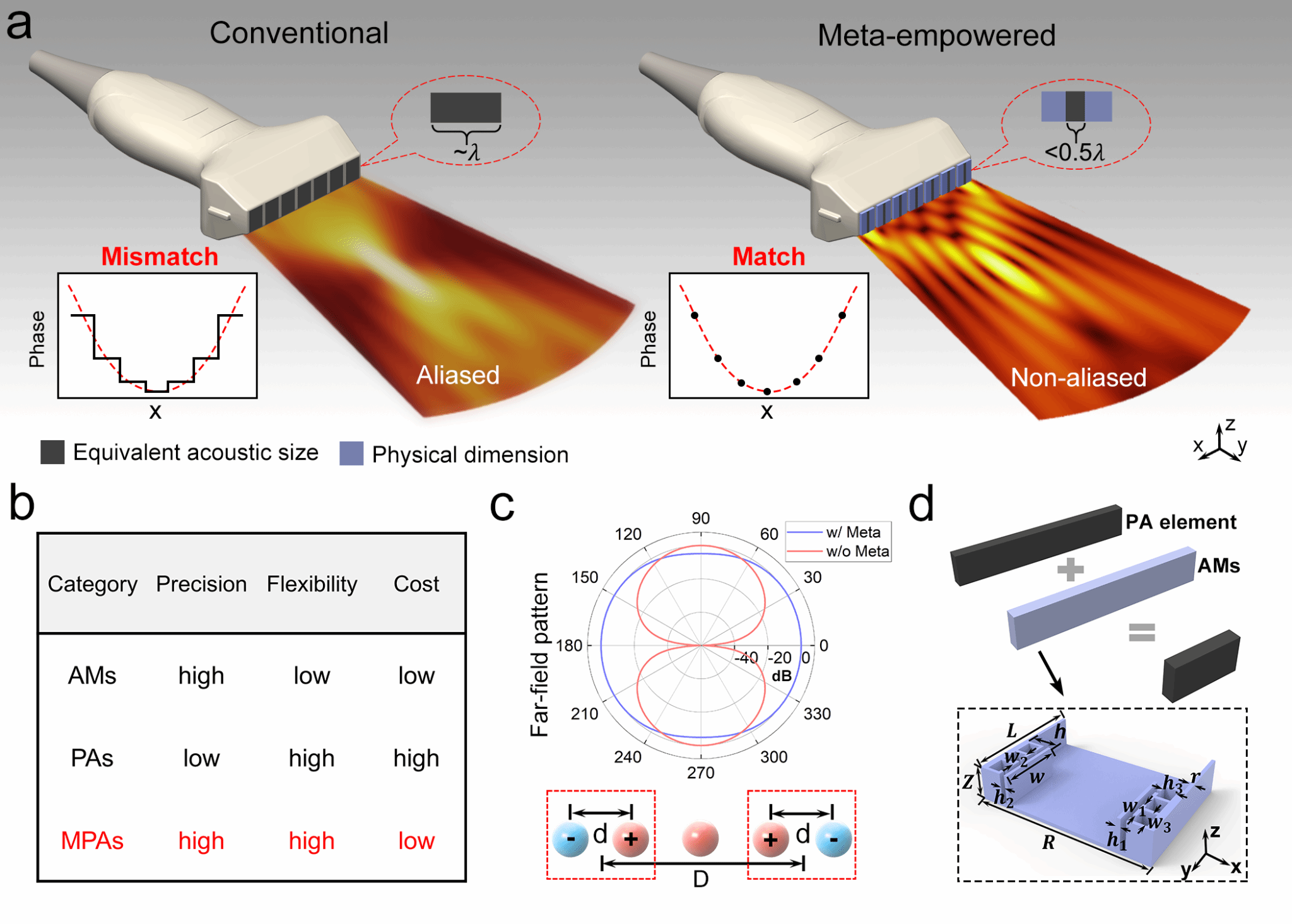 图1.高精度动态声波操控的工作机制。(a)PAs和MPAs声波操控原理示意图;(b)MPAs、AMs和PAs的性能对比;(c)超构换能器声学多极子模型;(d)MPAs超构单元结构。