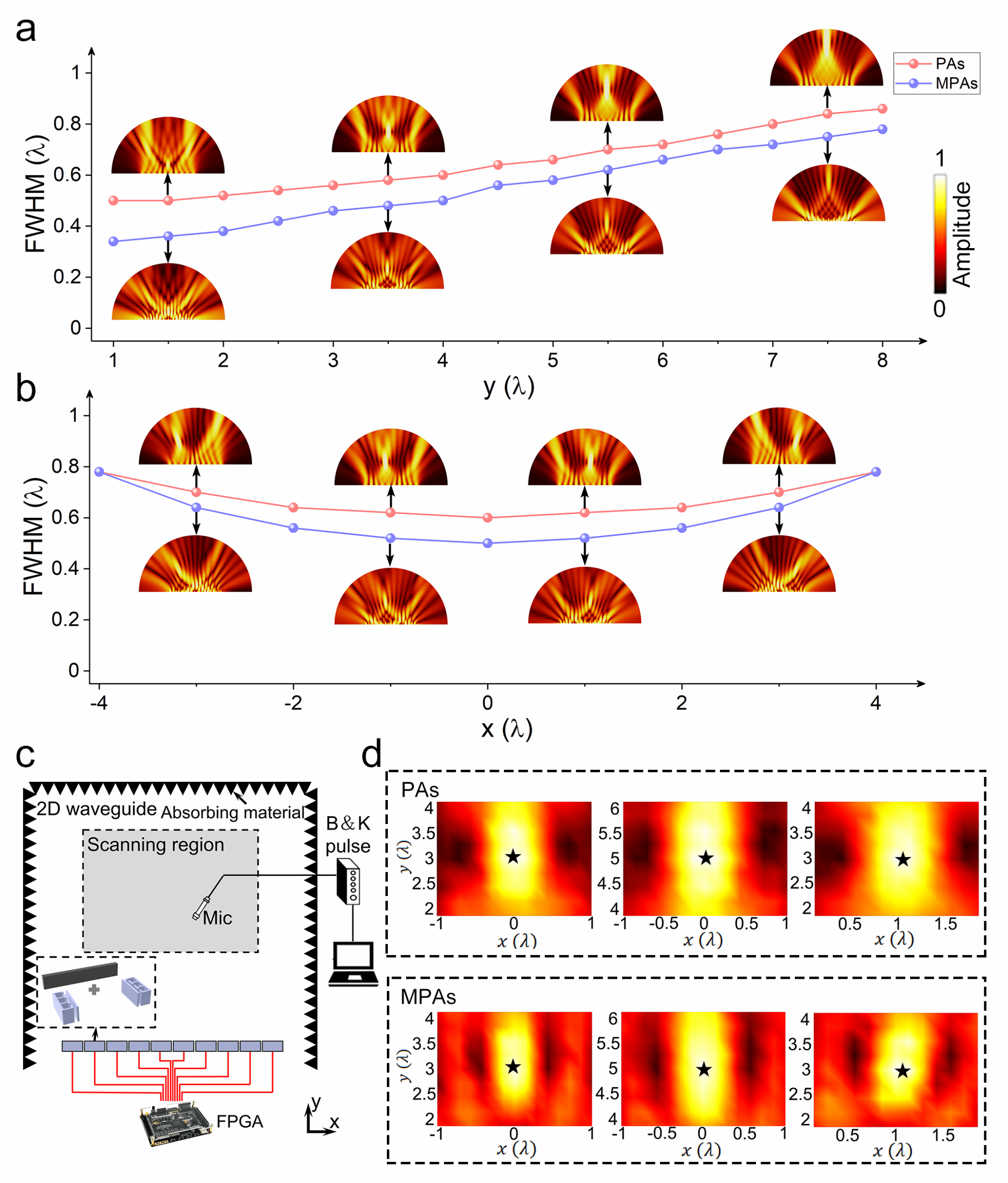 图2.MPAs和PAs的声聚焦性能对比。(a)从(0,1λ)到(0,8λ)的纵向聚焦扫描;(b)从(?4λ,4λ)到(4λ,4λ)的横向聚焦扫描;(c)实验装置示意图;(d)(0,3λ)、(0,5λ)和(λ,3λ)三种焦点位置处的声压幅值分布图。