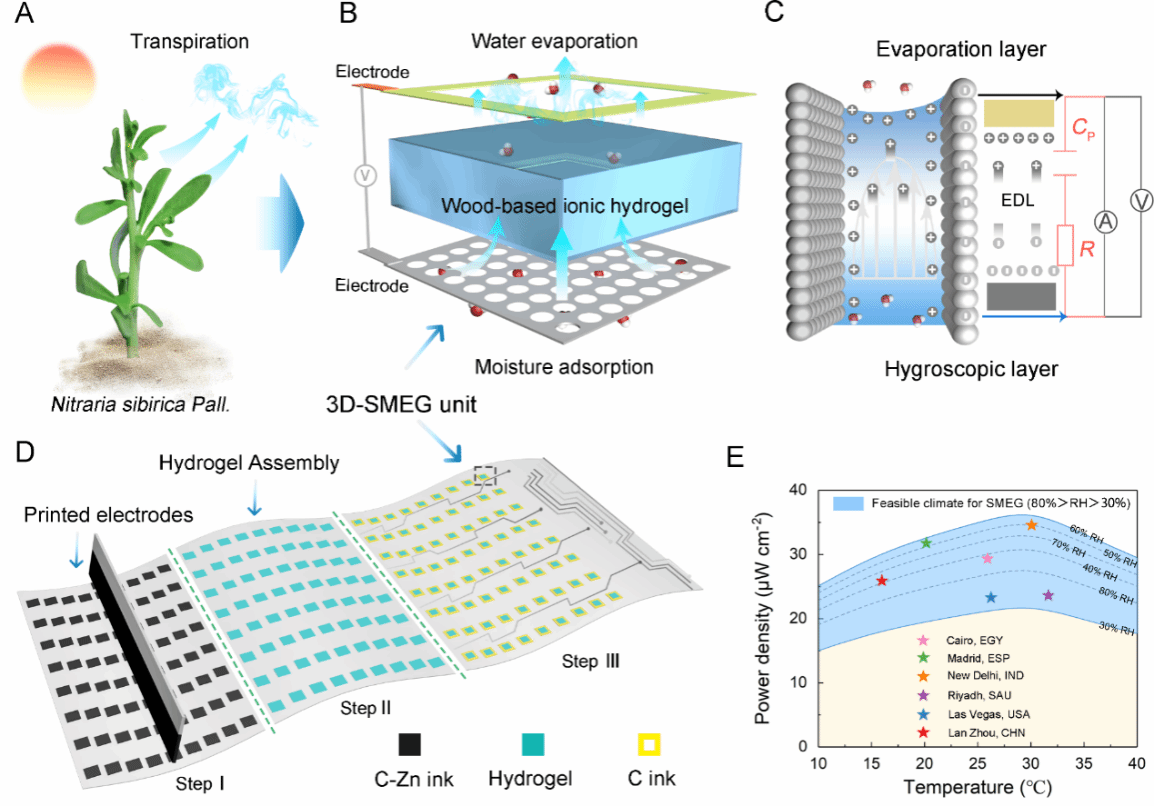 图1. A. 自适应干旱环境的植物Nitraria sibirica Pall.水分蒸腾过程;B. 3D-SMEG的结构示意图;C. 3D-SMEG工作机理示意图;D. 丝网印刷技术制备可规模化放大的3D-SMEG集成示意图;E. 3D-SMEG在6个代表城市服役的功率密度。