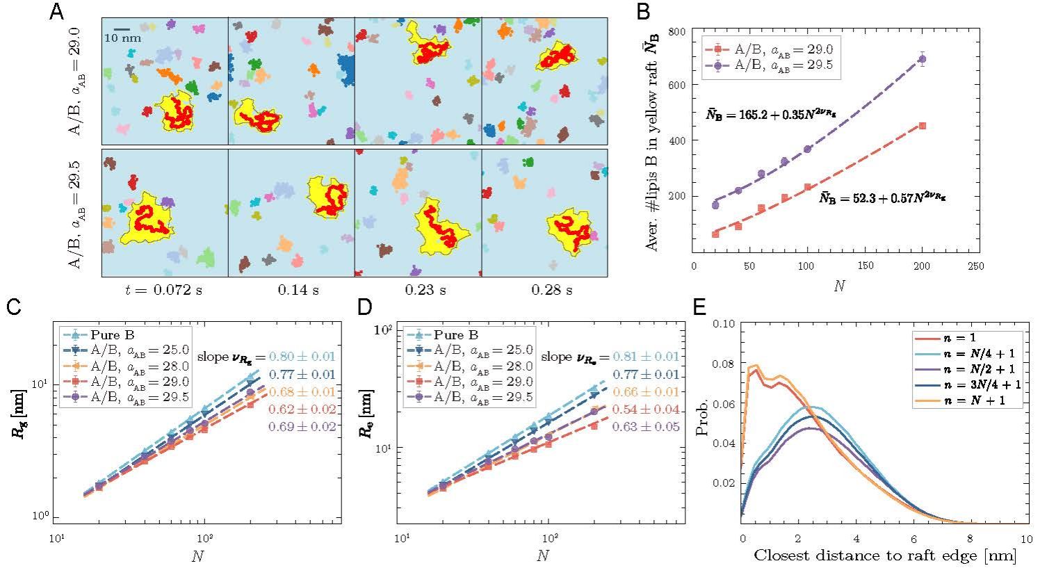 在A相基质(天蓝色)中,B型脂质团簇(以不同颜色区分)在膜上持续发生融合与裂解,导致团簇的大小和形状不断变化。吸附高分子链(红色)能感知周围B型脂筏(黄色)的分布,并动态调整自身构象(图 2a)。从膜生物物理学的角度来看,当高分子的吸附能足够抵消脂质混合熵和自身构象熵的损失时,它可作为“高分子胶水”,将多个小脂质簇聚合成较大的、与其共定位的脂筏。反过来,这些脂筏又对高分子施加“软限域”约束,使其在膜面呈现出溶胀但受限的二维构象特征(图2c-d)。