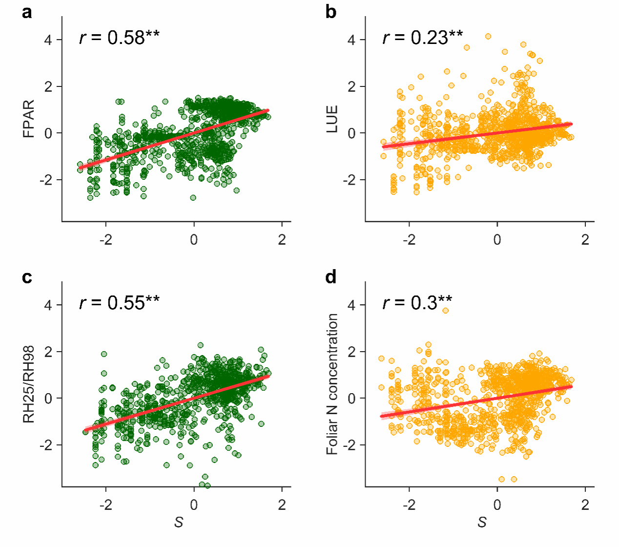 研究发现,树种多样性是全球森林光合作用的重要决定因子,其作用强度仅次于温度。 树种越丰富的森林,光合作用能力越强。这种“树种多样性的促进效应”具有明显的区域差异性,热带和亚热带地区(如亚马逊雨林、刚果盆地、东南亚热带雨林、中国南方亚热带森林)最为显著,而寒带高纬度地区则相对较弱。同时,研究也发现,SIF相较于传统遥感植被指数(如NIRV)在反映光合作用动态变化方面更具优势,这也说明发展叶绿素荧光遥感技术在理解全球碳循环过程中具有重要意义。