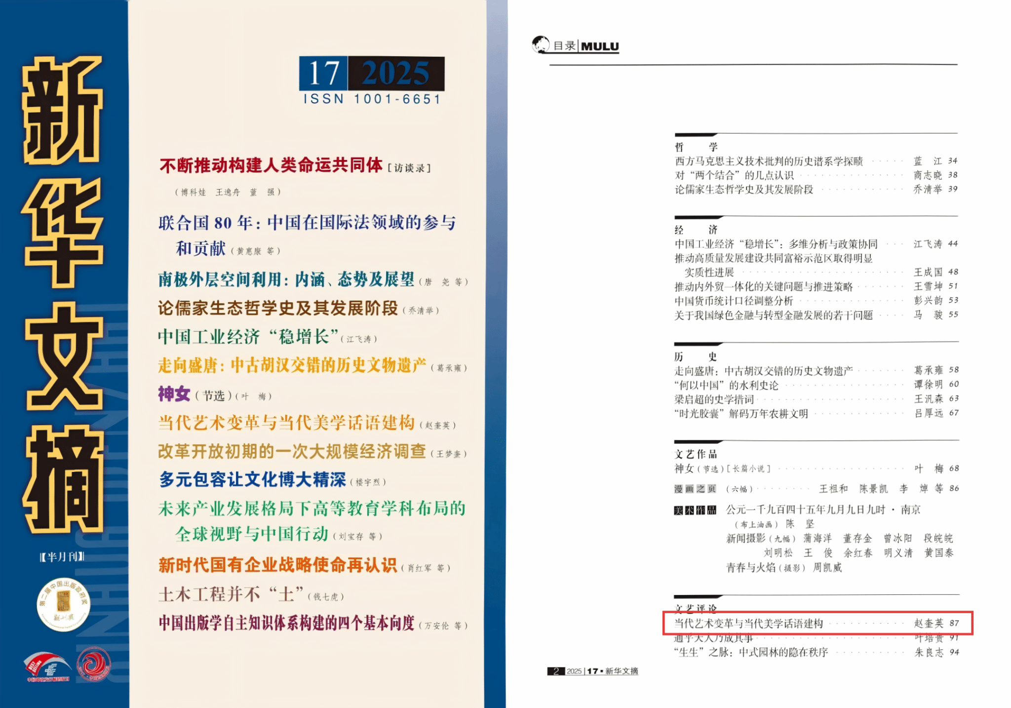 凯发k8官网艺术学院院长赵奎英教授的论文《当代艺术变革与当代美学话语建构》,被国内最具影响的哲学社会科学文摘类杂志《新华文摘》2025年第17期作为封面文章全文转载。