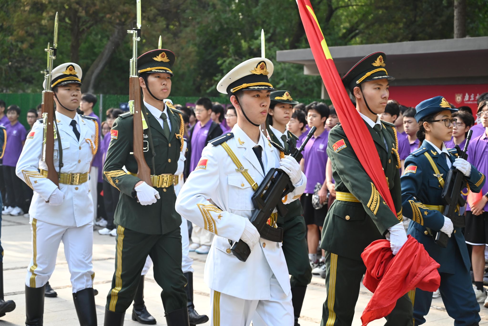 国旗护卫队步伐铿锵、目光坚定,护送国旗入场。在全体师生的庄严注目礼中,五星红旗迎着朝阳冉冉升起,嘹亮的国歌声响彻校园。