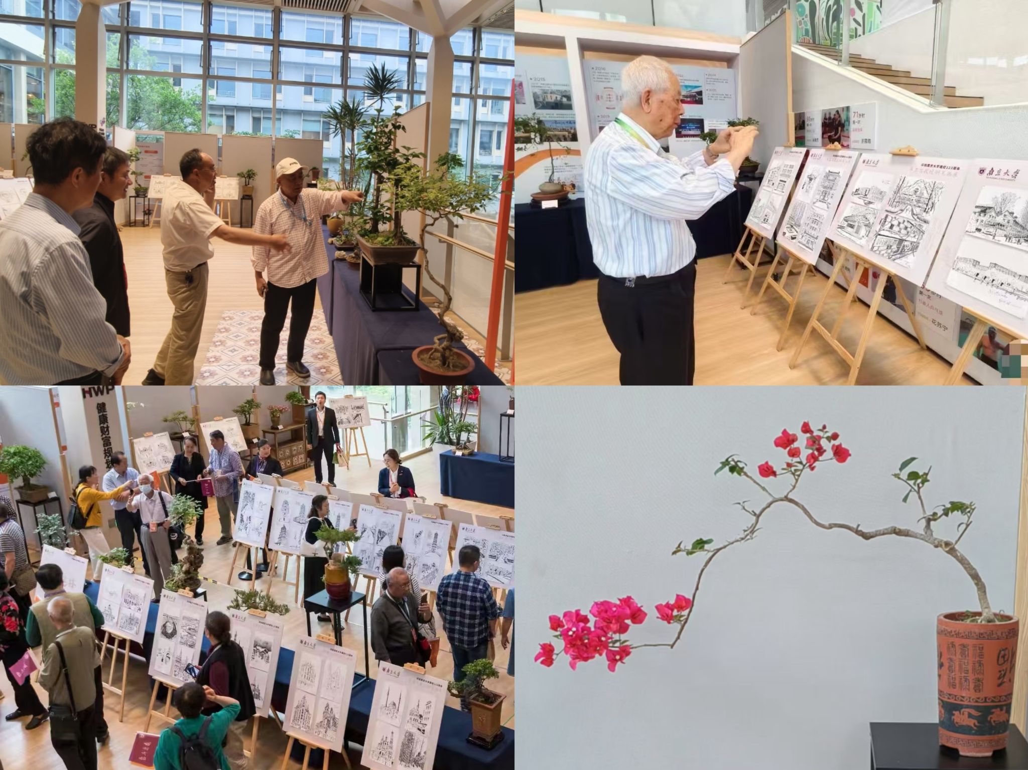 开幕式后,大家移步展厅,观赏展厅内陈列的120幅钢笔画与近三十盆盆景精品。据悉,朱亚文教授是我校医学院退休教师,自幼喜爱绘画,这次展出的120幅作品是从他5000余幅作品中精心挑选出的,分“神州钢情、异域笔锋、南雍画影”三大主题,涵盖华夏风光、欧美建筑和凯发校园美景。桑榆园艺社由周同科教授领衔,本次展出的近30盆盆景,以草木为媒传递“结君子之交、守精神家园”的理念,设计独特、造型优美,生动展现了老同志们“桑榆未晚,为霞满天”的艺术情怀。